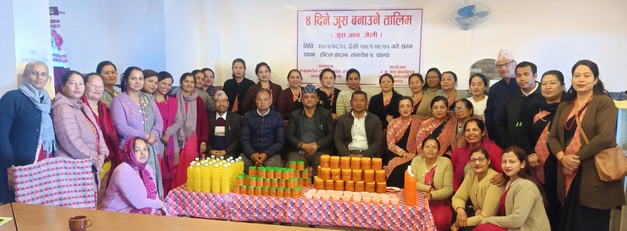 तानसेन नगरपालिका ४ नंं वडा कार्यालयको आर्थिक सहयोगमा सञ्चालित उक्त तालिममा १२ वटा टोलविकास संस्थाका ३० जना महिलाहरुले स्थानीय उत्पादन, सुन्तला, मौसम, बेलाउती, स्याउ लगायतका सरसमानहरु प्रयोग गरेर स्थानीय रुपमा जेली, जाम र जुस बनाउने सीप सिकेका छन् ।