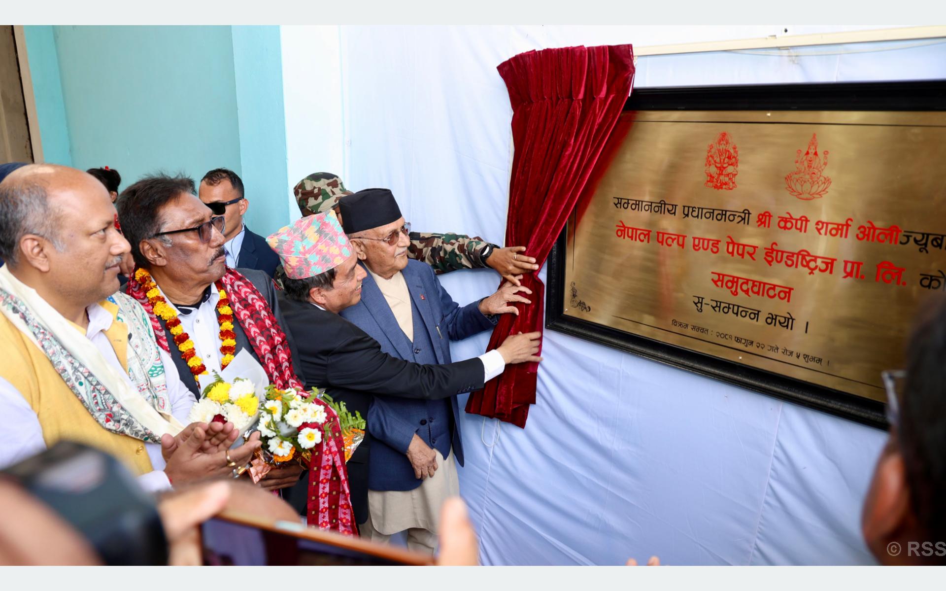 काठमाडौं । प्रधानमन्त्री केपी शर्मा ओलीले ‘नेपाल पल्प एण्ड पेपर इण्डष्ट्रिज’को उद्घाटन गर्नु भएको छ ।। महोत्तरीको गौशालामा आयोजित कार्यक्रमबीच प्रधानमन्त्री ओलीले सो उद्योगको उद्घाटन गर्नु भएको हो।