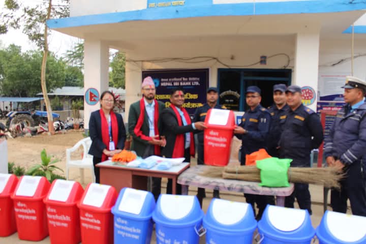 रामपुर शाखाका प्रबन्धक नबराज ढुङ्गाना सहित बैंकको टोलीले डस्टबिन, झाडू, माक्स र पन्जा लगायतका सरसफाईका सामाग्री हस्तान्तरण गरेको इलाका प्रहरी कार्यालय रामपुरका प्रहरी निरीक्षक राम बहादुर नेपालीले जानकारी दिनुभयो ।