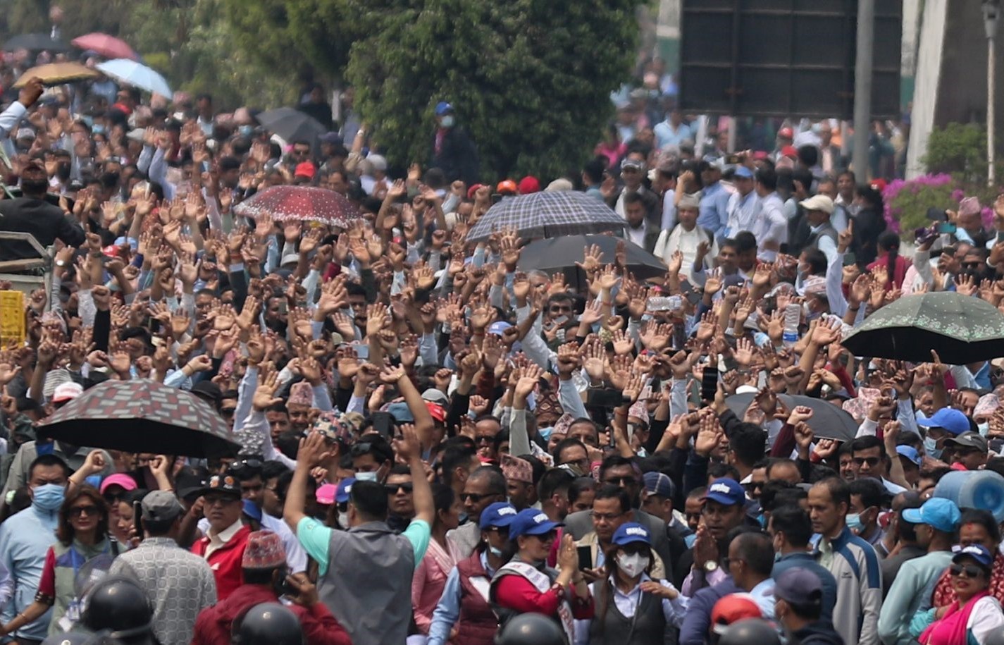 काठमाडौं। शिक्षा ऐन जारी गर्न माग गर्दै काठमाडौं केन्द्रित आन्दोलन गरिरहेका शिक्षक–कर्मचारीले बुधबार हात उठाएर सरकारको सांकेतिक विरोध गरेका छन् ।