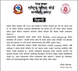 परीक्षासम्बन्धी आधिकारिक सूचना बोर्डले आफ्नो Website: www.neb.gov.np मार्फत सार्वजनिक गर्दै आएको र आगामी दिनमा समेत सो मार्फत सूचना प्रवाह गरिने हुँदा अन्य स्रोतबाट प्रवाह हुने सूचनामा भर नपर्न समस्त सरोकारवालाहरुमा अनुरोध समेत गरेको छ ।