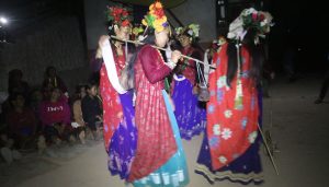 रामपुर,पाल्पा । ७३ वर्षीय पार्वती ठाडाले गीत सुरु गर्नु भएसँगै साथमा रहनु भएका ज्येष्ठ महिला तथा अन्य महिलाले एउटै लयमा गीत गाईरहेका छन् । नौ जना कन्या किशोरी लहरै समान हाउभाउमा नाचिरहेका छन् ।