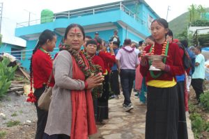 हामीलाई स्वागत गर्न तलै जाम भन्नु भो नचिनेका साथीहरुले । बाटोमा बाईक, जीपहरुको लस्कर थियो । पन्चेबाजाको तालमा पाहुनाहरुलाई स्वागत भयो । झण्डै सवा मिटर चौडा ढलानबाटोमा दायाँबायाँ महिला समूहका महिला दिदीबहिनीहरु फुल माला सहित उभिएका थिए । अघि अघि भर्खरका राम्रा राम्रा नानीहरु । साइडमा पन्चेबाजा समूहका कलाकारले बाजा मच्चाउदै थिए । तानसेन नगरपालिकाका सूचना अधिकारी एवम वरिष्ठ अधिकृत मेरा आत्मीय साथी भरत आचार्य सरसंग जम्का भेट भयो । वहाँहरुको राम्रो टिम थियो । लस्करै सामुदायिक भवनमा पुगीयो । शम्भु माविका शिक्षक एवम ढोलीमारा सामुदायिक होमस्टेका सचिव श्रीधन कुवर सरले वायरलेस माइक्रोफोनबाट स्वागत गर्दै स्वागत गीत र नृत्यको लागि बोलावट गर्नु भयो ।