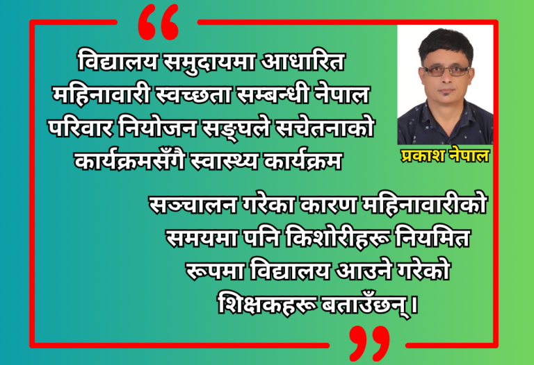 प्रकाश नेपाल पाल्पा । जिल्लाको तिलोत्तमा मावि, दोभान कक्षा १० मा अध्ययनरत विद्यार्थी मञ्जु रानाले महिनावारी भएको बेलामा विद्यालय नछोडेको तीन वर्ष भयो । … Continue reading महिनावारीलाई लाज होइन, सिकाइको अवसर बनाउँदै किशोरीहरु