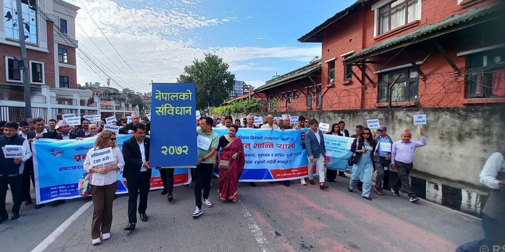काठमाडौँ, असोज ३ गते । संविधान दिवसका अवसरमा आज बिहान बृहत शान्ति र्यालीको आयोजना गरिएको छ । काठमाडौँको माइतीघरबाट सुरु भएको शान्ति र्याली भद्रकाली, सहिदद्वार, त्रिपुरेश्वर, थापाथली हुँदै पुनः माइतीघर पुगेर सभामा परिणत भएको थियो ।