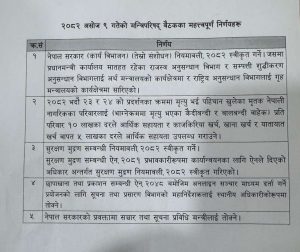 प्रधानमन्त्री सुशीला कार्कीको सम्बोधन लगत्तै पत्रकारमाझ निर्णय सार्वजनिक गर्नुहुँदै मन्त्री खरेलले सो जानकारी गराउनुभएको हो । त्यसैगरी सरकारको प्रवक्तामा सञ्चार तथा सूचना प्रविधिमन्त्रीलाई तोक्ने निर्णय पनि मन्त्रिपरिषदबाट भएको उहाँले जानकारी दिनुभयो । सरकारले सुरक्षण मुद्रण नियमावली २०८२ लाई स्वीकृत गर्ने निर्णय भएको छ ।