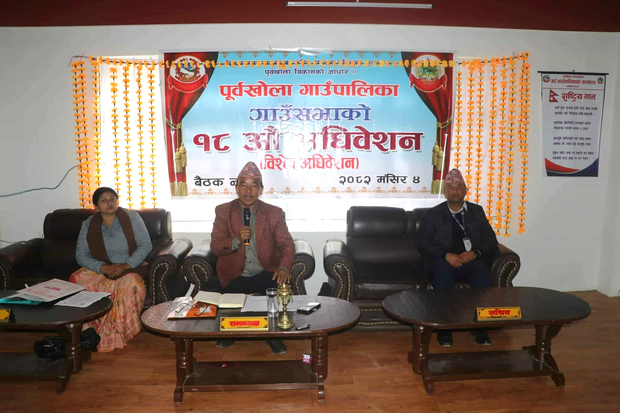 पुर्वखोला, पाल्पा । गाउँपालिका उपाध्यक्ष भागिरथी भट्टराईले पेश गर्नु भएको विभिन्न प्रस्तावहरु सर्वसम्मत पारित गर्दै पुर्वखोला गाउँपालिका गाउँसभाको १८ औ विशेष अधिवेशन सम्पन्न भएको छ।